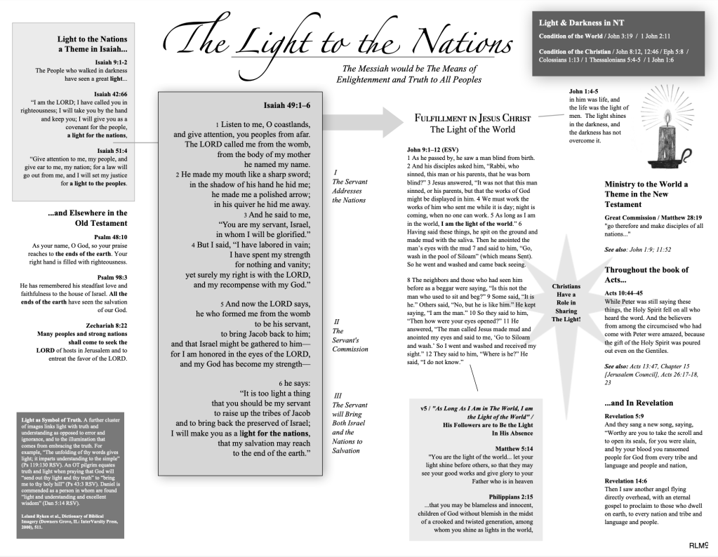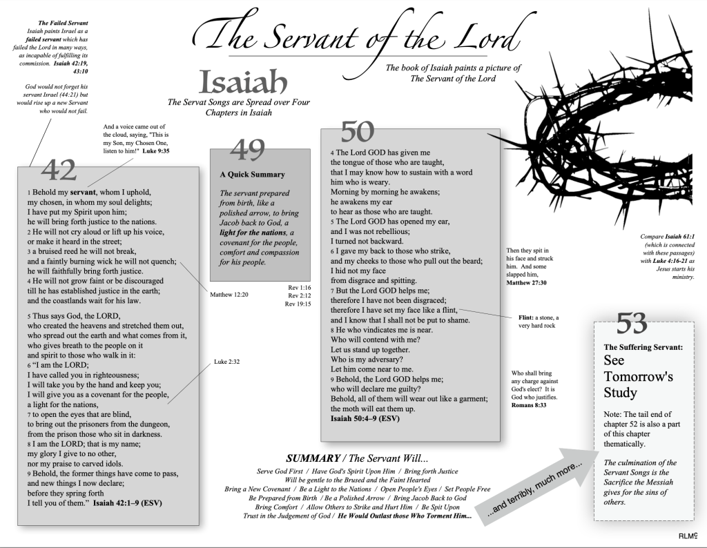 A few years ago I went through and made study sheets for the titles of Messiah in the Old Testament, with links to the New Testament. I have about 30 or so of these in the set. Here are three examples: The Son of Man, The Light to the Nations, The Servant of the Lord. These were designed to encourage individual study of each of these ideas and make prophecy a bit more available to the average person. This is a huge project that I always wanted to turn into a book. Maybe someday! Here is a sample.
